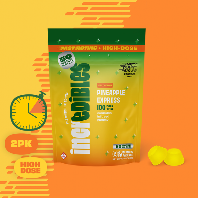 All hurry, no worry. Tropical sunshine, delicious juicy pineapple, and a faster onset to match your busy life. Quick, sweet, and to the point, incredibles Fast Acting Pineapple Express gummies are perfect for those in search of a swifter, more balanced edible experience. All aboard! Made with 100% pure cannabis oil in a perfectly blended mixture to ensure accurate dosing and consistency. Perfect for busy schedules and trying new things.